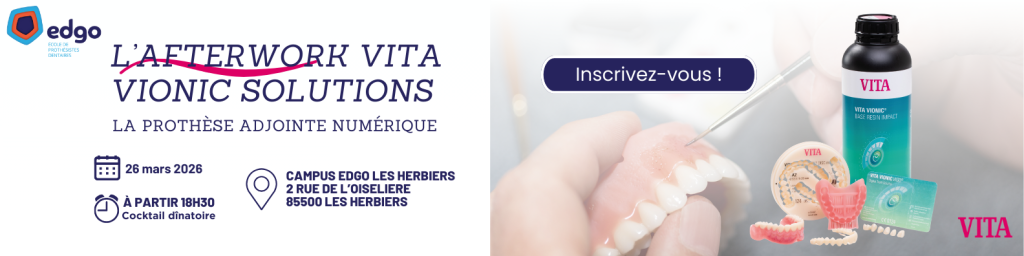 Le Campus EDGO Les Herbiers, en partenariat avec VITA Zahnfabrik France, vous invite à une soirée exclusive dédiée aux professionnels de la prothèse dentaire. Venez découvrir la polyvalence de l’écosystème VITA VIONIC SOLUTIONS pour la prothèse adjointe numérique.